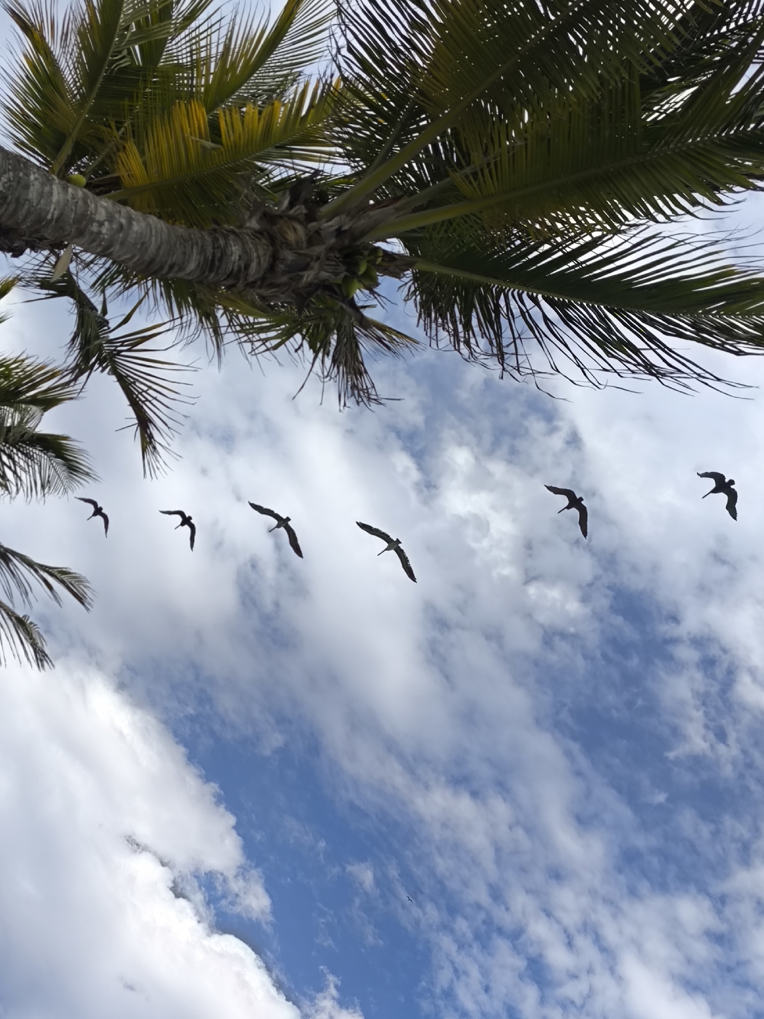 The image, likely taken from a low angle, depicts a scene at El Yaque, Venezuela. A portion of a palm tree, with its trunk and green fronds, occupies the upper part of the frame. Below, a partly cloudy sky fills the majority of the scene, revealing patches of blue. Silhouetted birds are arranged across the sky, their forms contrasting with the bright backdrop.