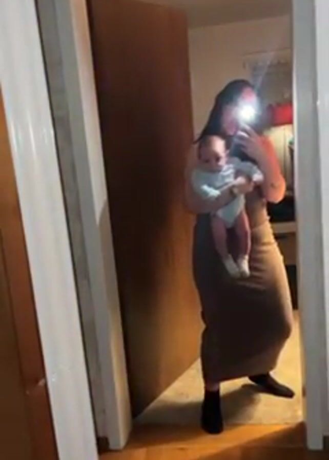 A woman is standing in a doorway, holding a baby, and taking a mirror selfie