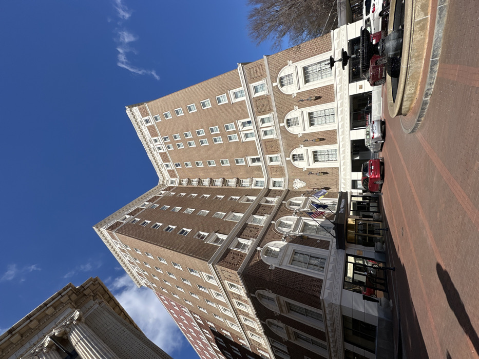 A tall brick building, possibly a hotel, extends into a clear blue sky with minimal clouds