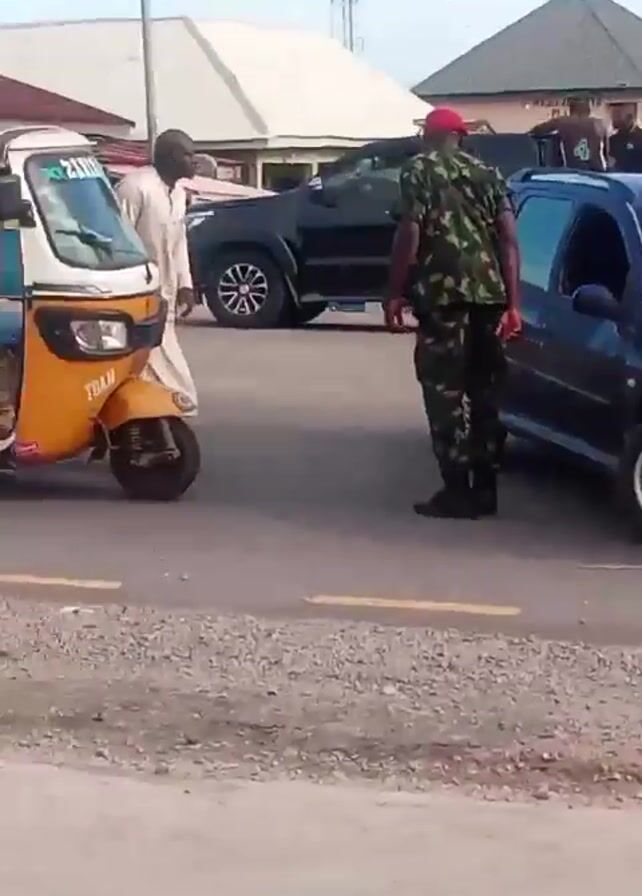 A uniformed soldier with a red beret stands in the middle of a street with vehicles and pedestrians moving around him. A blue Peugeot car is parked to his right, and a yellow tricycle is to his left. Further back, a black pickup truck has two people in its bed. A young boy in a school uniform walks past the soldier. In the background, there are shops and buildings. The sky is partly cloudy.