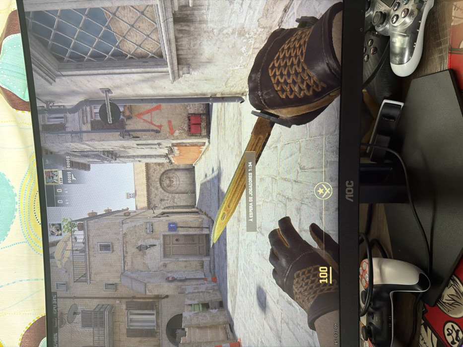 An eye-level photograph captures a computer monitor displaying a video game, positioned on a desk in Mirandela, Portugal. The monitor, an AOC model, shows a first-person perspective of a virtual character's gloved hands holding a golden-colored knife. The gloves are dark brown with a distinct patterned texture on the back. The in-game environment depicts a narrow, unpopulated urban street or alleyway with multi-story, light-colored stone buildings featuring balconies, arched doorways, and windows with grilles. A yellow patio umbrella is visible on one balcony. Traffic cones are present on the left side of the street, and a blue directional sign is mounted near a building. A red 'A' with an arrow is spray-painted on a building wall. The in-game user interface displays "FPS: 98" and "GPU 84%" at the top left, a score of "0 0" and "$0000" at the top right. A central message reads "À ESPERA DE JOGADORES 1:34" (Waiting for players 1:34). At the bottom left, "100" (health/armor) and a date "15-03-09" are visible, alongside a star-shaped icon at the bottom center. Beneath the monitor, on a dark desk surface, a white and black PlayStation 5 DualSense controller is connected by a cable, and a clear, translucent PlayStation 4 DualShock controller rests nearby. A multi-colored, patterned fabric item is partially visible underneath the controllers, and a patterned fabric or wallpaper serves as a background above the monitor.