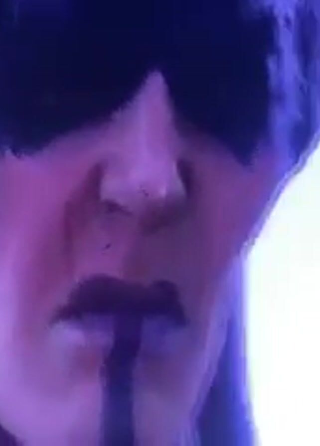 close-up of a person's face with dark makeup around the eyes and mouth and a dark headpiece resembling horns. The camera then shifts to a shot of a cloudy sky. Next, a blurry shot shows a rocky terrain or pile of rubble, and lastly, a woman in a dark outfit is partially visible on the right side of the frame. The overall video quality is poor.
