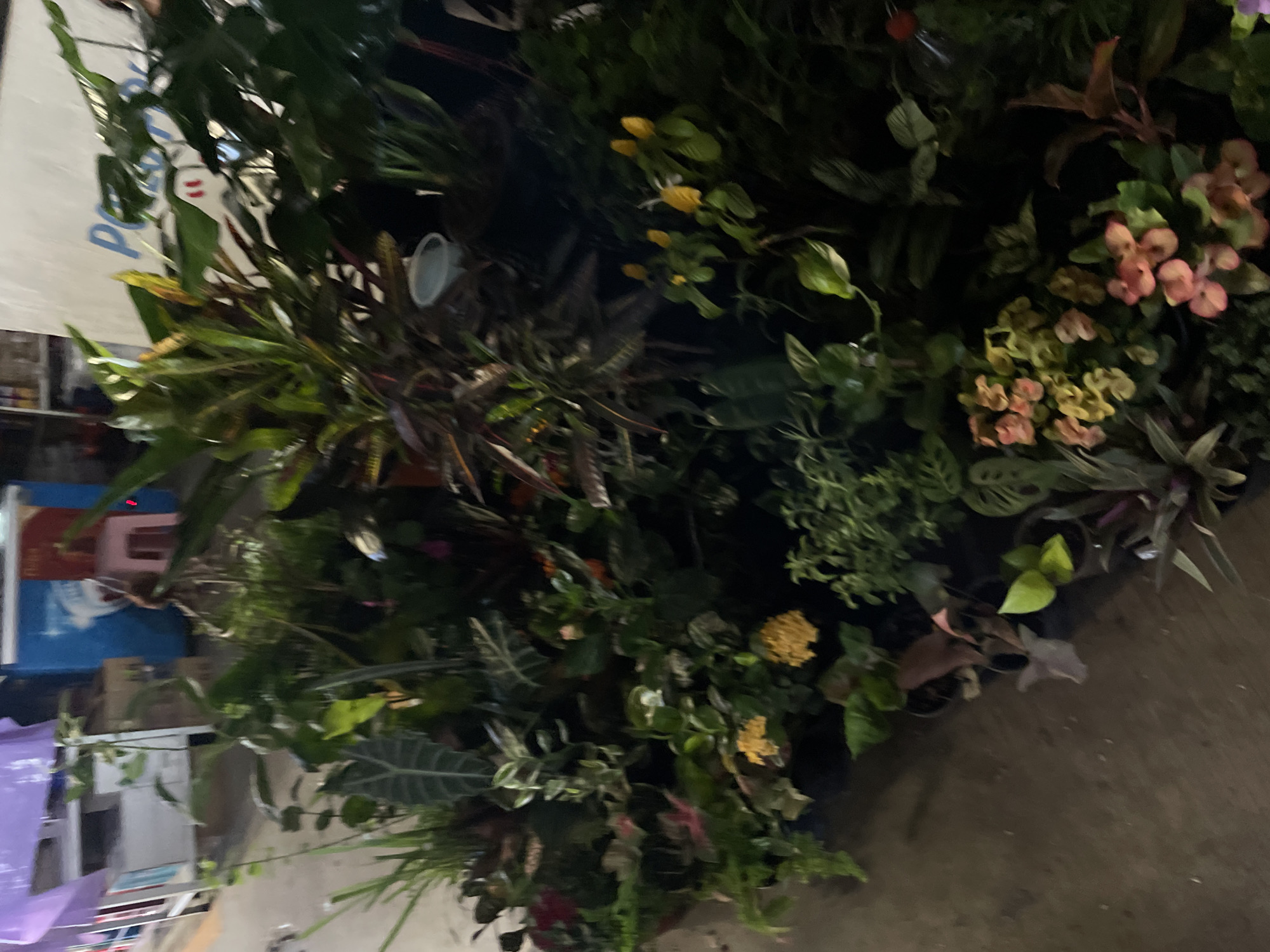 display of various plants, likely at a market or plant sale. A variety of green foliage is visible, including leafy plants, flowering plants with yellow and pink blooms, and plants with patterned leaves. The plants are in pots, arranged close together. In the background, there are glimpses of what appears to be a shop or stall, with items and packaging visible. The setting is likely a marketplace, given the close arrangement of plants. Based on the prompt, the location is a city in Puerto Escondido, Mexico. The atmosphere appears to be a busy market environment, with a variety of plants on display for sale.
