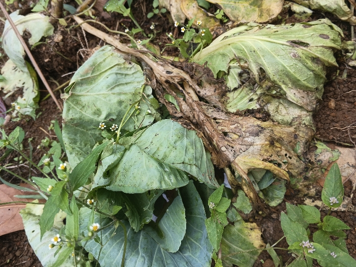 decaying cabbage leaves in a garden bed