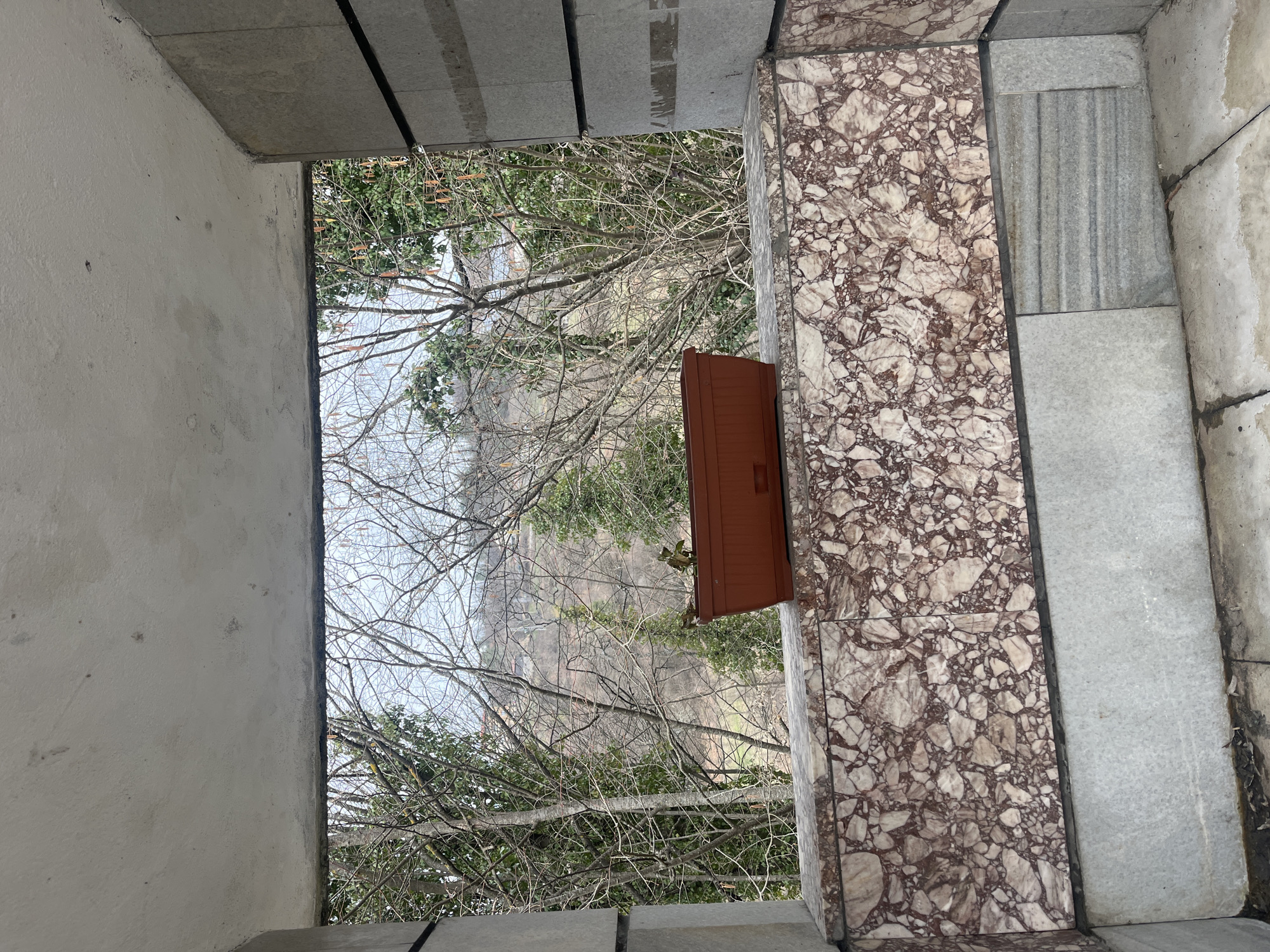 The image captures a view from a concrete and stone opening in Lovtsi, Bulgaria, looking out onto a natural landscape. The immediate interior consists of a light grey concrete ceiling and floor. The vertical framing elements are a plain grey concrete pillar on the left and stacked grey rectangular stone blocks on the right, bisected by a dark horizontal line. A mid-ground parapet is faced with polished, fractured-patterned dark red and white marble tiles, above lighter grey stone panels, one exhibiting distinct horizontal striations. Centered on this parapet is a dark brown rectangular plastic planter containing a small green plant and dried organic material. The exterior view reveals a hilly, forested landscape, dominated by leafless deciduous trees and interspersed evergreens, under a pale blue, overcast sky. Faint structural outlines are visible on distant hills. No people, specific actions, or interactions are depicted.