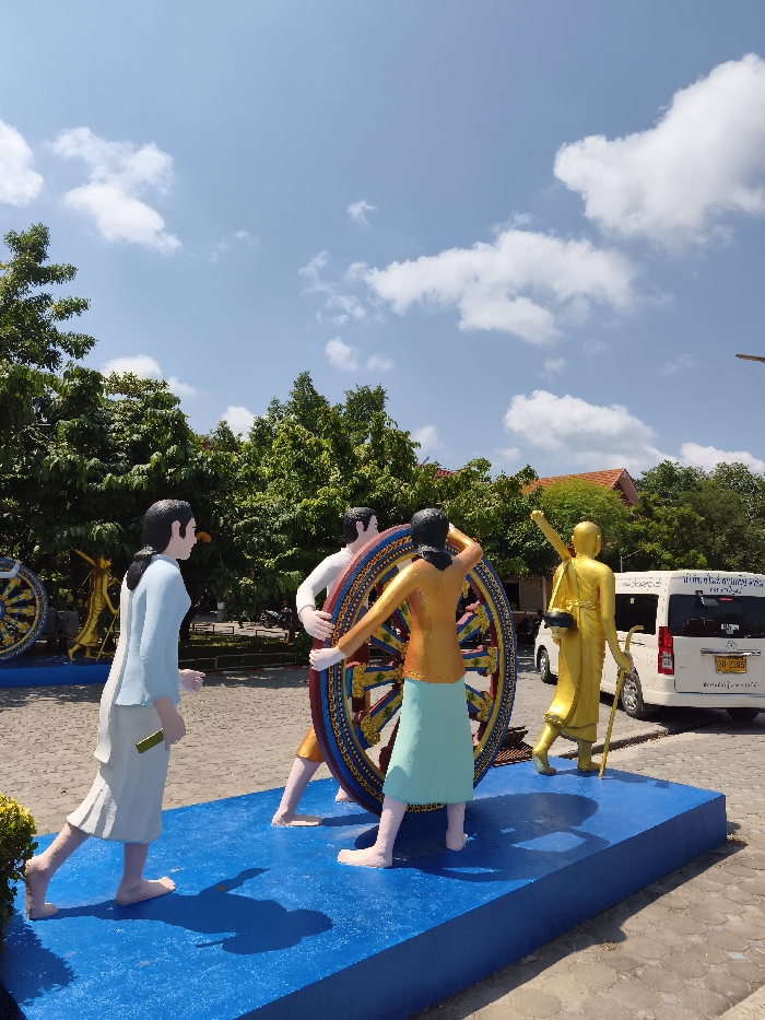 Outdoor scene showcasing a group of statues. One statue depicts a person in light blue clothing walking. Another two figures are positioned around a large, colorful wheel. A golden statue of a monk with a walking stick stands to the right. A white van is parked in the background, with trees and a bright blue sky filling the rest of the scene. The statues are placed on a blue platform.