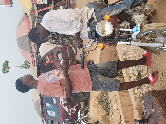 The image depicts an outdoor scene in Kwamba, Nigeria, likely a market or roadside area, under a bright, overcast sky