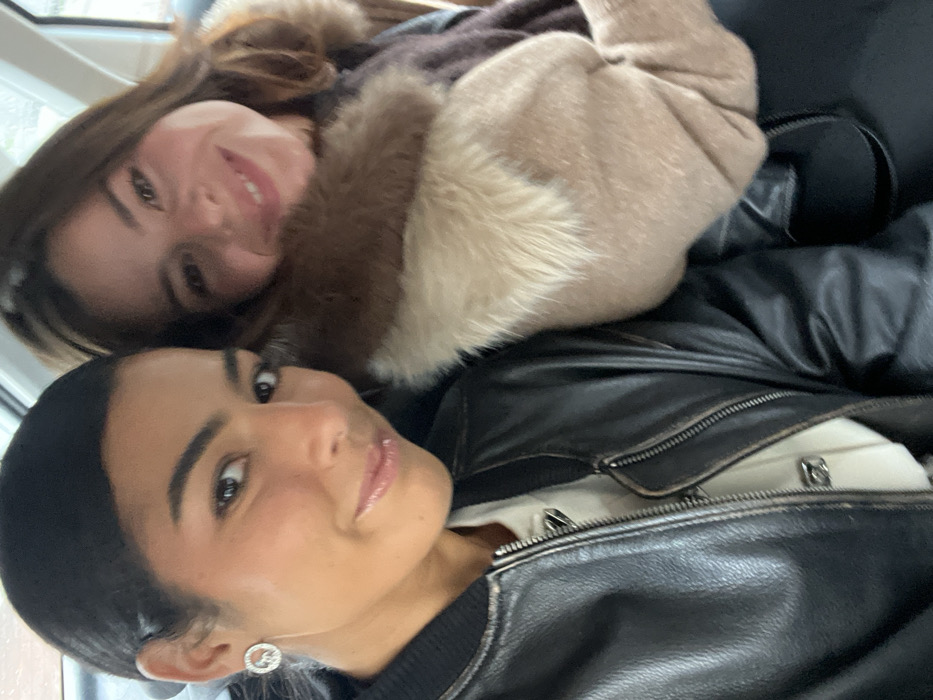 The image displays a close-up, eye-level photograph of two young adult females positioned side-by-side, likely inside a vehicle as suggested by the blurred window background. The individual on the left has dark hair, dark eyes, and a light-brown complexion, exhibiting a subtle smile. She wears a black, zippered leather-like bomber jacket over a light-colored top with metallic fasteners. A circular, silver-toned earring is visible on her left ear. The individual on the right has light brown hair, fair skin, and a broad smile. She is wearing a brown coat or jacket featuring distinct brown and lighter beige/cream fur or faux fur trim around the collar and chest area. Both individuals are looking directly at the camera. The specific location of Rueil-Malmaison, France, cannot be confirmed from the visual information provided within the image.
