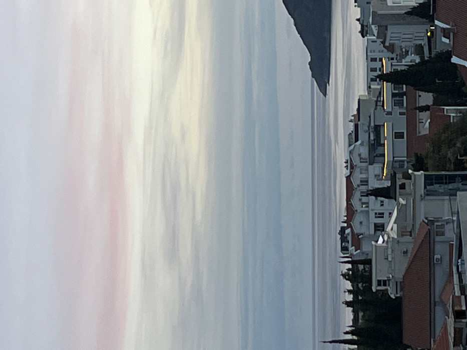 A sideways view showcases a town along a coast. White buildings with red roofs line the water's edge, interspersed with dark green trees. A mountain rises from the water on the right side of the town. The sky is a blend of white, pale pink, and light blue, creating a soft and diffused light across the scene. The sea is a mirror of the sky, with a calm and smooth surface.