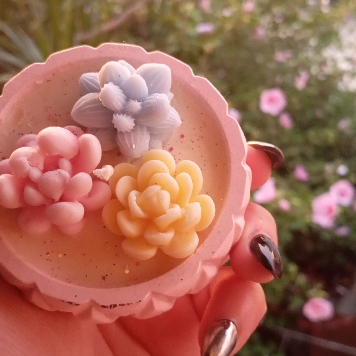 A pink, decorative container holds three succulent-shaped candies or soaps in pale blue, pink, and yellow. The container itself has a scalloped rim. Tiny sparkles are visible within the substance. A hand with painted fingernails holds the container. In the blurred background, greenery and pink flowers are present, suggesting an outdoor setting. The image has a warm, slightly diffused lighting.