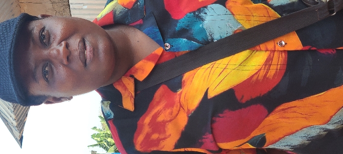 This image depicts a single dark-skinned individual, appearing to be an adult, captured in a chest-up portrait shot in an outdoor setting within the city of Alayi, Nigeria. The individual wears a black baseball cap and a collared button-up shirt featuring an abstract, multi-colored pattern on a black background, with prominent hues of red, orange, yellow, and blue. A dark strap, possibly from a bag, crosses diagonally from the individual's left shoulder towards the lower right. A small, silver-colored stud earring is visible in the individual's left earlobe. The individual's expression is neutral, with direct eye contact or a slight gaze to the right of the camera. The background is moderately blurred but reveals a light-colored sky, a section of a corrugated metal roof, and green foliage, indicative of a daytime, possibly semi-urban or residential environment. No discernible interactions or specific actions are observed beyond posing for the photograph.