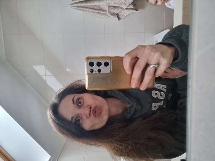 A woman with long brown hair and blue eyes takes a selfie in a bathroom mirror. She wears a grey GAP hoodie and a ring. Her lips are puckered into a kiss. A towel hangs above her. The background features white tiles and a partial view of a child, possibly standing on a toilet seat. The phone held up to capture the image has a tan-colored case and multiple camera lenses.