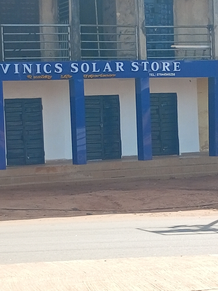 The image displays the facade of a two-story commercial building located in Aguata, Nigeria. The ground floor houses a business identified by a prominent blue signboard with white uppercase lettering that reads "VINICS SOLAR STORE." Below the main store name, smaller yellow text states "@ Quality Life Experience," and a contact number, "TEL: 07044546238," is positioned to the right. The storefront consists of three distinct bays, each fitted with closed, dark teal, horizontally paneled metal double doors. These bays are separated by thick, square pillars painted blue, matching the fascia. The wall visible behind the closed doors is white. A concrete raised platform or steps provides access to the store level. In front of the building, there is a strip of reddish-brown, unpaved earth, followed by a light-colored paved road occupying the foreground. A shadow, possibly from an overhead structure, is visible on the road surface. The upper floor of the building, constructed from what appears to be concrete or stucco, features two openings protected by horizontal metal bars or railings. No individuals, vehicles, or active interactions are present within the frame.