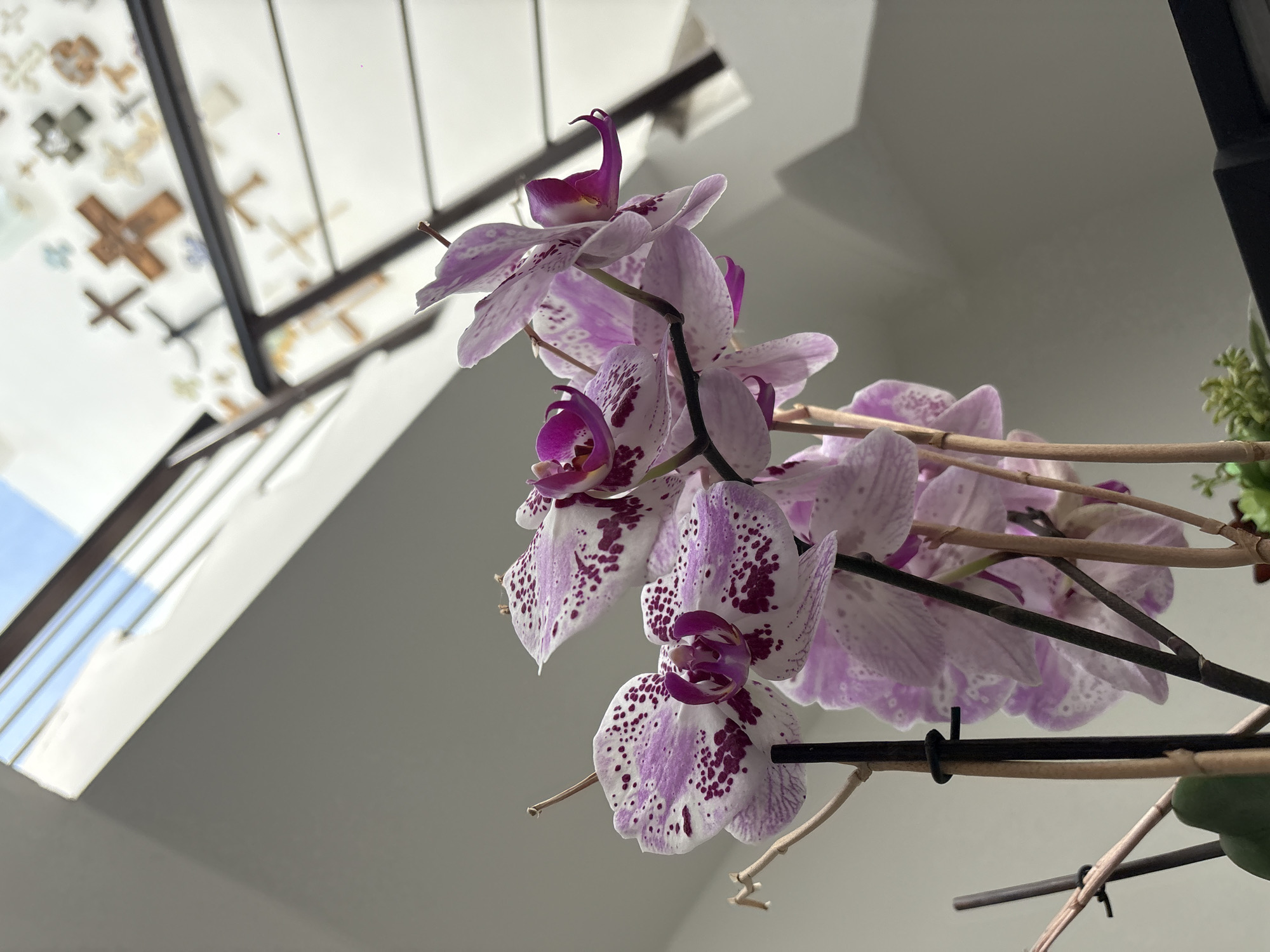 This image captures an interior scene in San Juan Cuautlancingo, Mexico. The primary subject is a potted orchid plant, prominently displayed in the foreground, featuring multiple white and light purple blooms heavily speckled with dark purple and magenta. The orchid stems are supported by slender wooden and dark-colored stakes secured with ties. In the background, to the upper left, a bright skylight or window opening reveals a clear blue sky, indicating direct natural light. To the upper right, a white wall is decorated with numerous crosses of varying sizes, materials (wood, stone, metal), and designs, affixed in a scattered arrangement. A dark metal handrail or balustrade, suggestive of a staircase or upper-level balcony, partially obstructs the decorated wall. The scene is brightly illuminated by natural light, creating shadows on the white walls. No individuals are present.