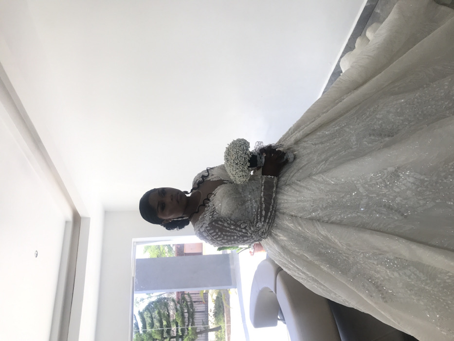 A woman is depicted standing indoors, identified as being in Rayfield, Nigeria. She is wearing a white, full-sleeved, V-neck ball gown wedding dress with glitter and sequin embellishments. Her dark hair is styled in an updo, and she wears prominent long, dangling earrings. In her left hand, she holds a dense, spherical bouquet composed of numerous small white flowers. The woman looks directly forward with a neutral expression. To her left, a light-colored, curved sofa is partially visible. Behind her, a large glass window or door reveals an outdoor area with green coniferous trees, fencing, and what appears to be part of a building under natural sunlight. The indoor environment features plain white walls, a white dropped ceiling with a recessed light, and a potted plant near the window. The floor is a light-colored tile or polished surface.
