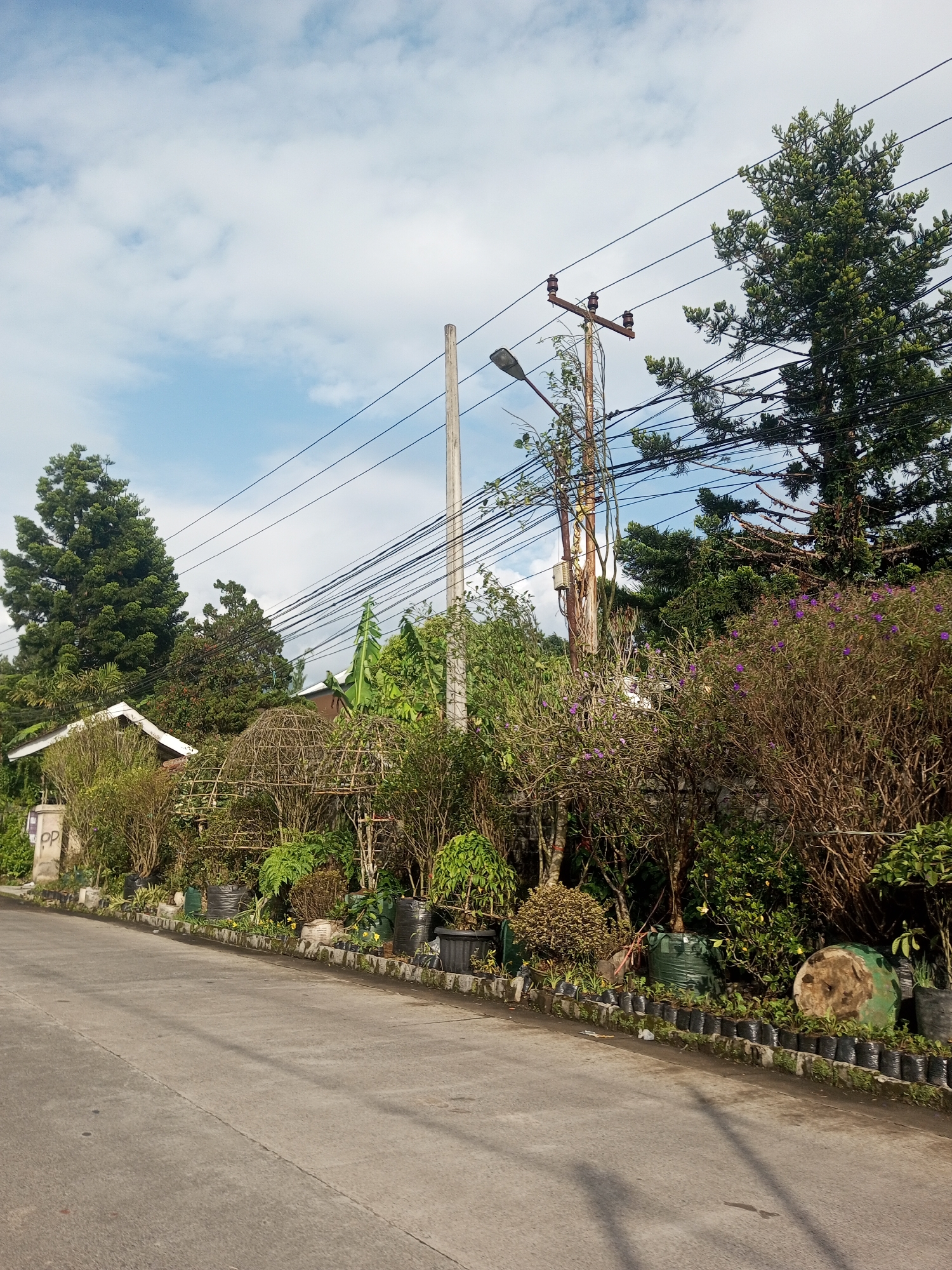 street scene in Mya Sit Kaing Ywar Thit, Myanmar. A grey concrete road stretches through the frame. Along the road's edge, a variety of plants and shrubs are potted in black plastic bags and larger pots, lining the side of the road. These plants vary in height and foliage, with some showing purple flowers. Behind the plants, there are several trees and a house with a white roof. Utility poles with numerous power lines run overhead. The sky is partially cloudy, with patches of blue.