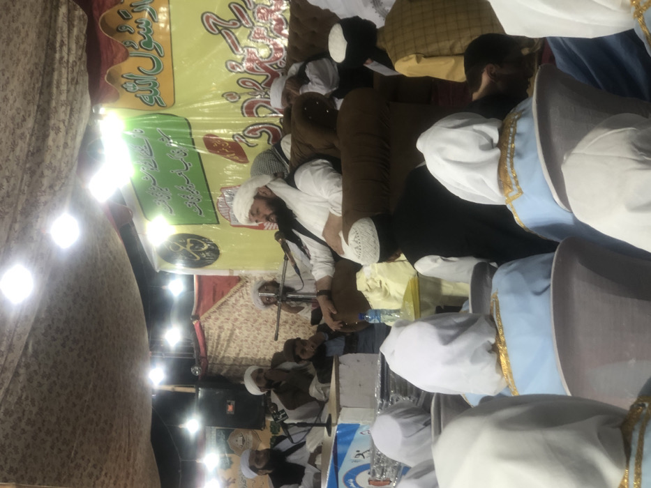 A gathering of men dressed in traditional Muslim attire, seated on chairs and the floor. Some men are wearing white turbans, while others are wearing white caps. There is a speaker at a podium with a microphone. A large yellow banner with green writing is in the background. There are also several lights visible. It appears to be a religious or cultural event.