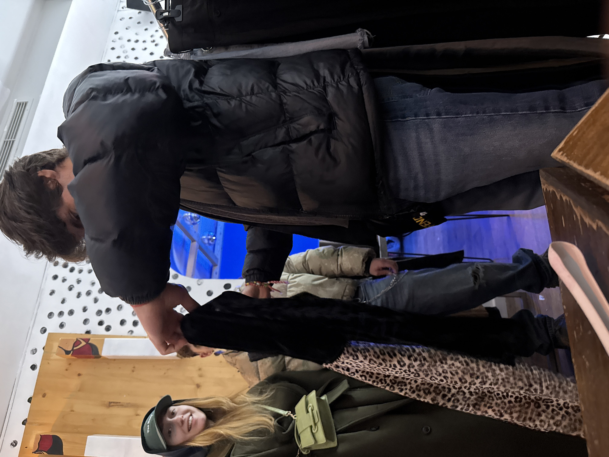 three people inside a retail establishment, likely a clothing store. One person, seen from the chest up, is wearing a black puffer jacket and dark jeans. They appear to be helping or adjusting clothing for another person, who is wearing a tan jacket and blue jeans and sitting on a stool. The third person is a woman standing and wearing a green coat, a hat and has a green bag. A garment hangs between the person in the puffer jacket and the woman. The backdrop indicates a retail setting with clothing racks and display shelves. The location cannot be determined without additional contextual information.