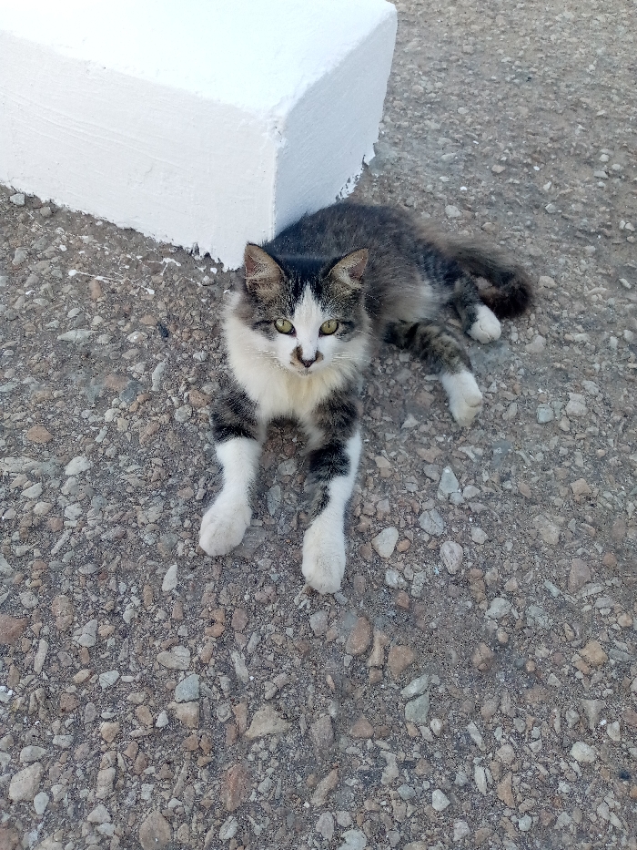 - "A gray, white, and black cat lies on a gravel surface next to a white rectangular block" by FM-Q5qB73, licensed under CC BY 4.0