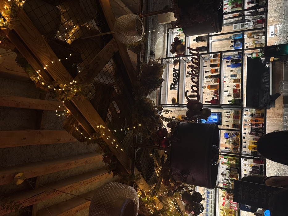 An indoor scene featuring wooden stairs adorned with fairy lights, juxtaposed against a well-stocked bar. The bar prominently displays illuminated shelves filled with various liquor bottles. Decorations include hanging light fixtures and plant arrangements. The orientation is unconventional, with the stairs appearing vertical and the bar leaning to the side.