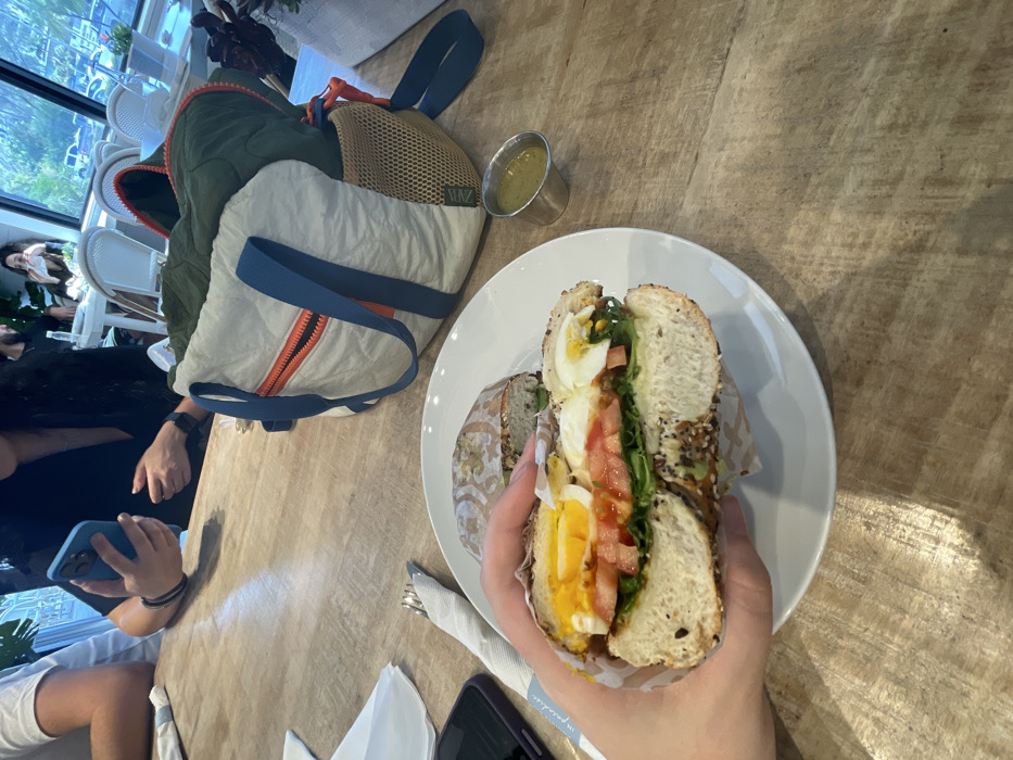 A bagel sandwich with egg, tomato, and greens is held in someone's hand. It's on a white plate next to another bagel half wrapped in paper. A small silver cup filled with green dip sits beside them. A partially visible green and white backpack lies on the light brown wooden table. Another person sits to the left, holding a blue phone. The background shows a cafe with people sitting at tables.