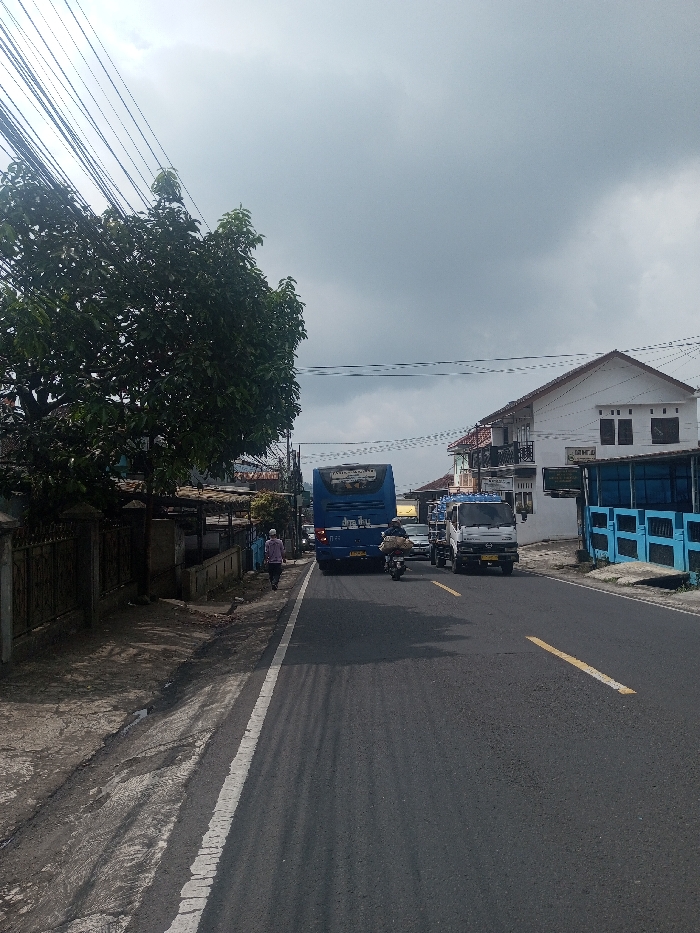 The scene depicts a street in Niz Lakuk, India, under an overcast sky. A paved road, marked with a solid white line on the left and a broken double yellow line in the center, extends into the distance. On the left, a concrete sidewalk borders a drainage ditch, flanked by a metal fence and dense green foliage from trees and bushes. Utility lines are visible crisscrossing overhead. On the right side of the road, multi-story white buildings with dark roofs and multiple windows are present, with a distinct light blue fence or wall in the foreground further down the street. Vehicular traffic occupies the road, moving away from the viewer. A large blue bus, marked "JAYA RAYA" and "TRANSPORT" with a license plate "1721", is centrally positioned. To its right is a white utility truck with a blue tank in its bed. Behind the bus, a person operates a motorcycle, carrying a large bundled item. On the left sidewalk, a lone individual wearing light-colored clothing walks away from the camera.