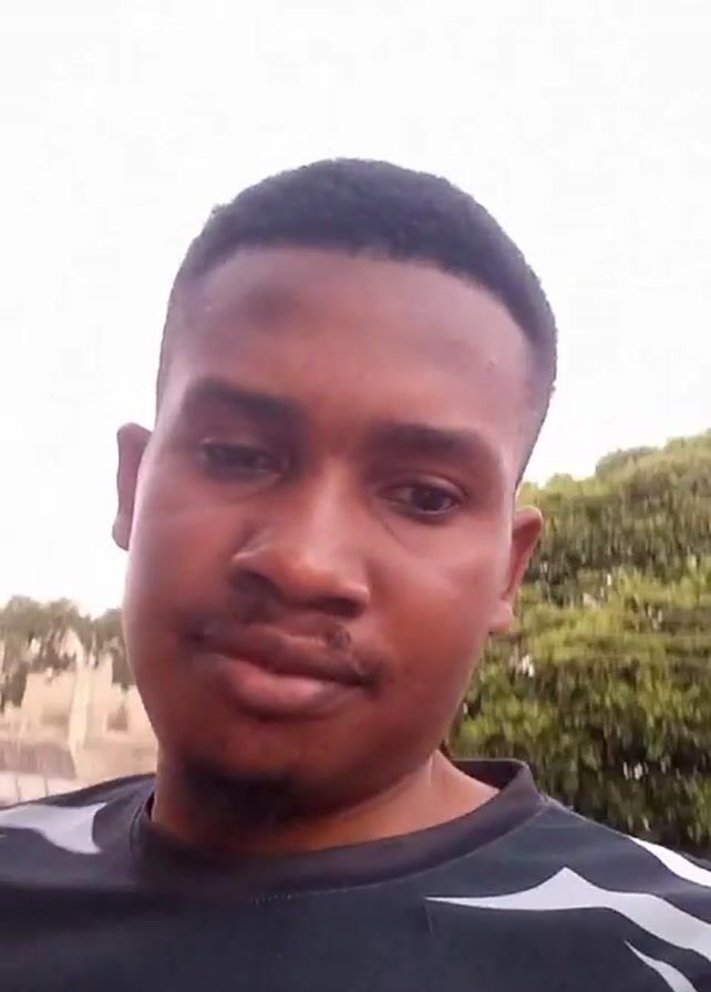 A close-up shot shows a man with short, dark hair and brown eyes looking directly at the camera. He has a mustache and a slight beard. He is wearing a black Under Armour shirt with white stripes on the sleeves. The background shifts from a bright, white sky to include green trees and branches with leaves. The camera appears to be hand-held, causing slight movement.
