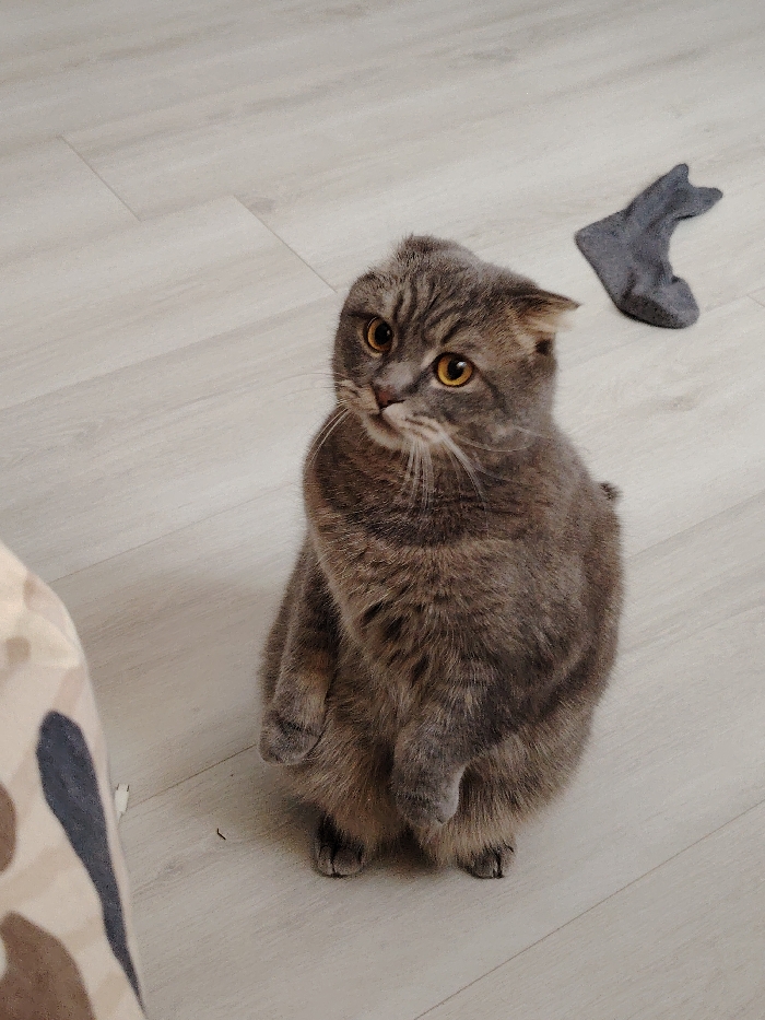 The scene is an indoor residential setting in the city of Марковский, Russia. A Scottish Fold cat, exhibiting grey tabby fur, distinctive folded ears, and amber eyes, is positioned centrally, standing upright on its hind legs with its front paws held against its chest. The cat's head is tilted slightly to its left, and its gaze is directed forward. A single dark grey sock lies crumpled on the light grey laminate flooring in the upper right background. A portion of a light-colored object with irregular dark patterns, possibly a textile item, occupies the lower left foreground.