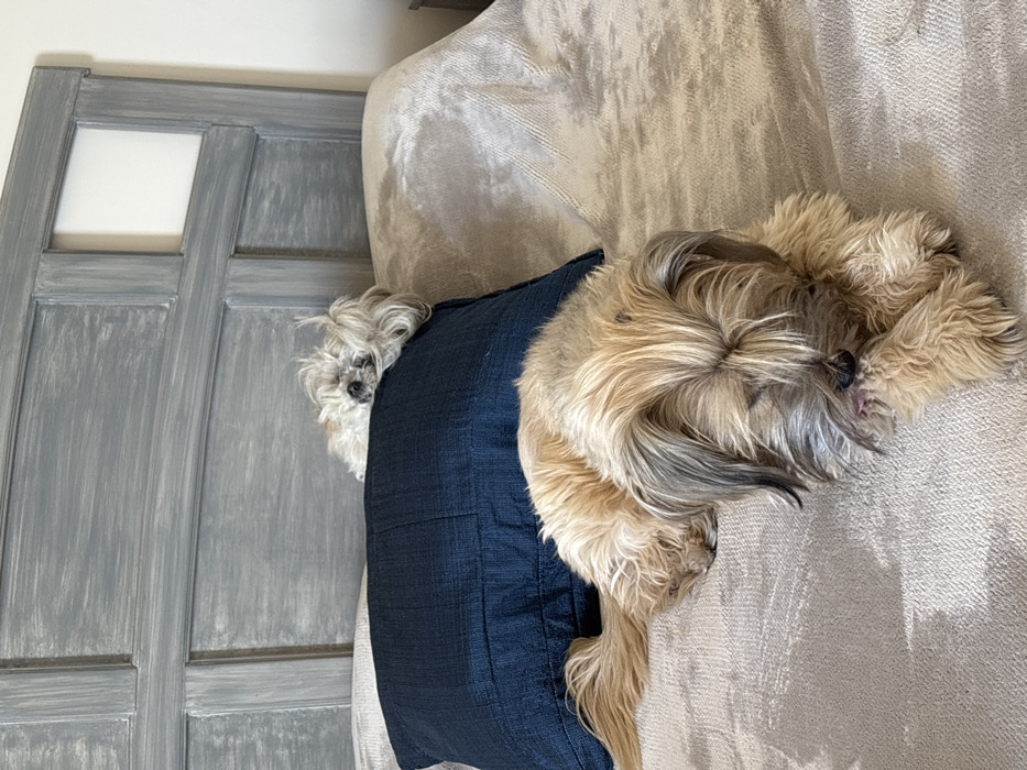 Two Shih Tzus lie on a light beige couch. One dog is mostly hidden behind a dark blue pillow and is lighter in color, with its head peeking out. The other dog, closer to the viewer, is larger and has a darker, tan coat with gray on its face. The dogs are positioned in front of a gray decorative headboard.