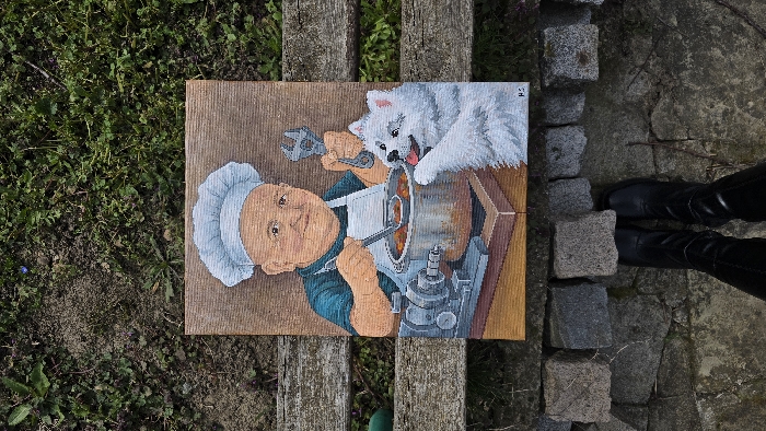 A rectangular painting rests upright on a weathered wooden bench in an outdoor setting in the city of Unknown, Unknown. The painting depicts a smiling, bald, elderly man wearing a white chef's hat and a white apron over a teal shirt. He holds a ladle, stirring a pot of reddish-brown stew, while clutching a silver-colored wrench in his left hand. A fluffy white dog, with its tongue extended and a paw raised, looks towards the pot. A grey mechanical device is positioned beside the stew pot. The painting is signed 'H.S.' in the lower right corner. Above the wooden bench, the ground displays dark soil with sparse green grass and weeds. Below the bench, a pair of black mid-calf boots belonging to the photographer are visible on a surface composed of irregular grey cobblestones and flagstones, interspersed with small scattered twigs.