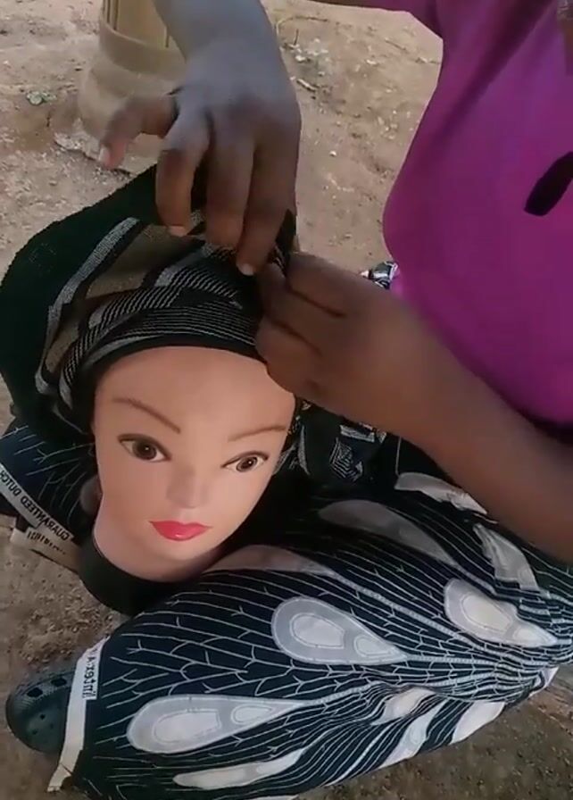 person sitting with a mannequin in their lap, practicing a head wrap style. The person wears a pink short-sleeved shirt, black pants and black Crocs. They’re using their hands to carefully arrange the fabric of the head wrap, which is patterned in black, white, and gray. The mannequin has a realistic-looking face with brown eyes and red lips. The fabric the mannequin is sitting on has a black background with a white leafy pattern, and the text "Quality Guaranteed Dutch Wax Hollandais" is printed on it. They are outside on a dirt patch. A white column is partially visible in the background.