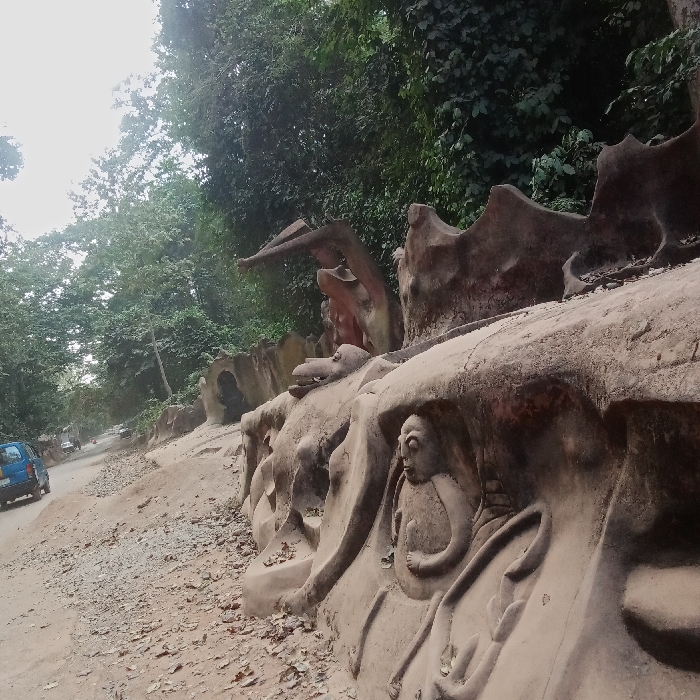 This image depicts a section of the Osun-Osogbo Sacred Grove, located in Osogbo, Osun State, Nigeria