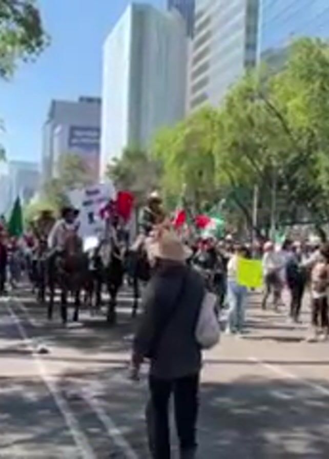 street demonstration or parade taking place on a sunny day in an urban environment. The procession appears to be led by people on horseback, some carrying Mexican flags. People on foot follow, many also carrying flags and signs. The crowd seems to be mostly comprised of adults, and they are spread out on the street, walking in the same direction as the riders. Buildings, including skyscrapers, are visible in the background, indicating a city setting. Trees line the street, adding a touch of green to the scene. The atmosphere appears to be a mix of celebration and protest, as participants walk and carry banners.