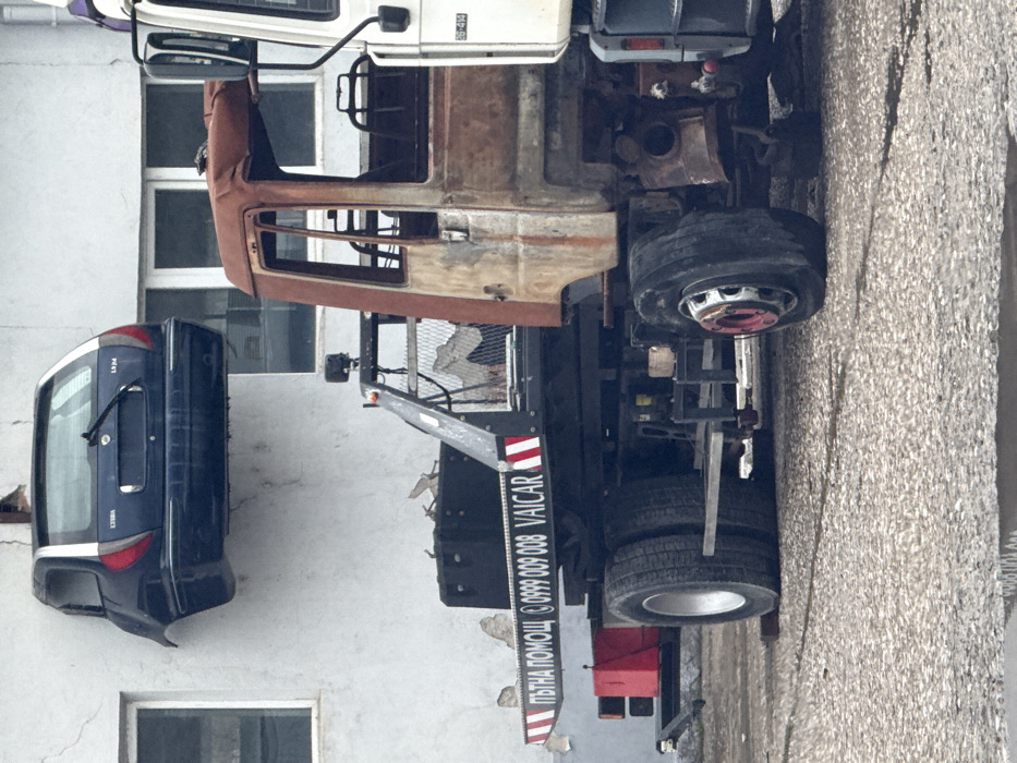 The image depicts an outdoor industrial or workshop setting in Gabrovo, Bulgaria. In the background, a light-colored, possibly concrete or stucco building wall exhibits multiple cracks and peeling surfaces, with two visible rectangular windows. High on this wall, the dark blue rear section of a Lancia Lybra station wagon is mounted, displaying "LYBRA" badging and lacking a license plate. In the mid-ground and foreground, two commercial vehicles are parked on a textured, grey paved surface that appears damp in areas. The primary vehicle in focus is a black flatbed tow truck. Its rear ramp is marked with "ПЪТНА ПОМОЩ" (Roadside Assistance), a phone number "0999 009 008," and "VAICAR" in white text, bordered by red and white striped reflective tape. The visible side of the tow truck features dual rear wheels with silver-colored rims. On its flatbed, dark, amorphous objects are present, possibly covered. To the right of the tow truck, partially obscured, is the heavily rusted, reddish-brown cab section of a different, older truck. This cab is missing its doors and interior components are visible. A single front wheel from this truck is visible, featuring a reddish-orange hub and a deflated tire. A partial white license plate, "26-414," is visible on the far right. No individuals are present in the scene.