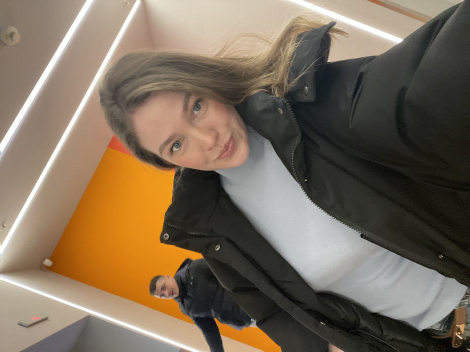 A woman poses for a selfie, slightly angled. She wears a black puffer jacket over a light blue turtleneck. Behind her and slightly below is a man also in a dark jacket. The background consists of a bright orange wall and a white ceiling with linear lighting fixtures. A smoke detector is visible on the ceiling. The scene appears to be inside a modern building.