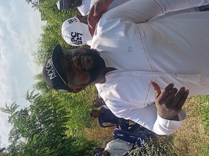 A man in a white robe and a "NYCN PRESIDENT" baseball cap stands outdoors. Other people are visible, including one wearing a white "APC 2027" baseball cap. The man in the robe smiles. Grass and trees fill the background. The man's robe says "BOI" on the chest. He extends his hand.