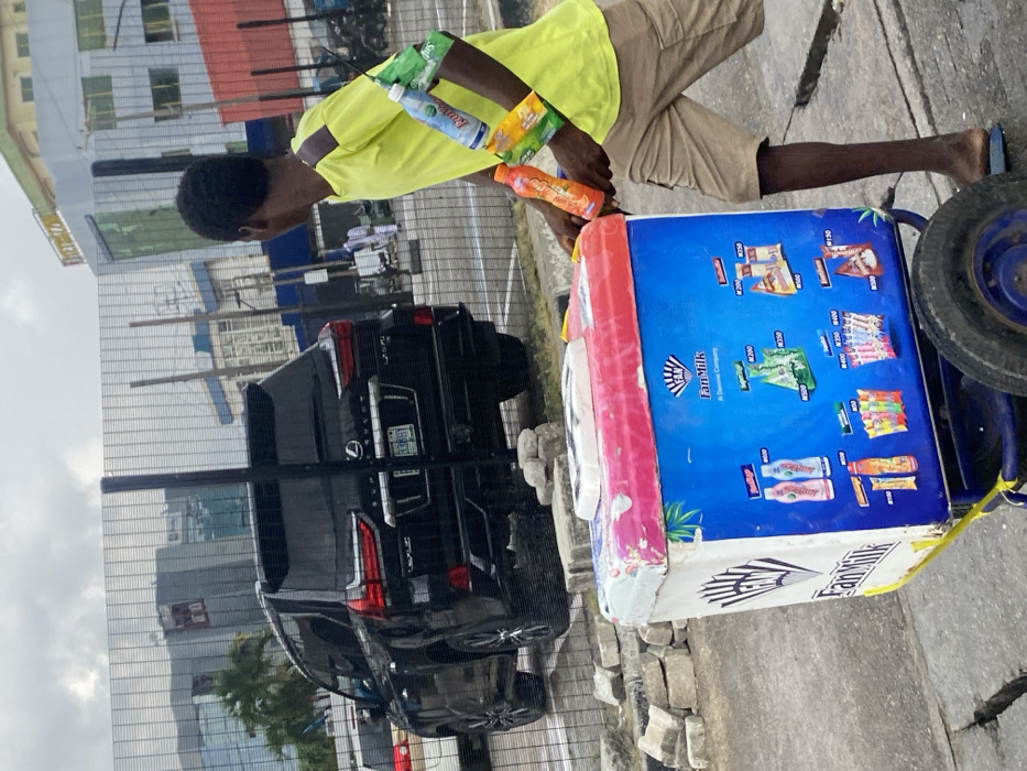 - "A young male, with short dark hair, wearing a neon yellow short-sleeved t-shirt with black shoulder panels and khaki cargo shorts, pushes a two-wheeled "FanMilk" branded cooler cart along a cracked asphalt surface in an urban environment in Itirin, Nigeria" by FM-ZL5X22, licensed under CC BY 4.0