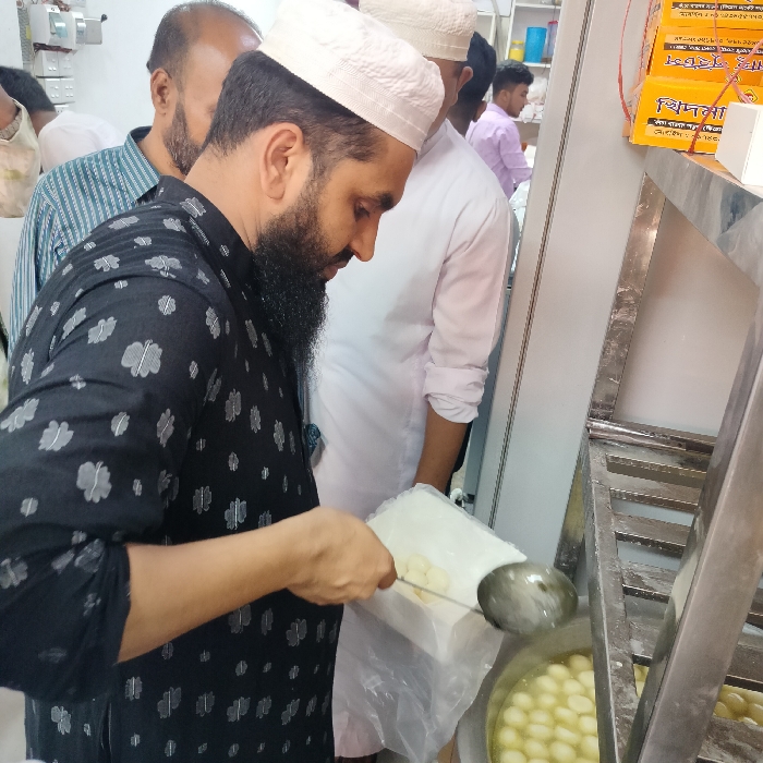 The scene takes place inside a shop located at 22.686 latitude and 90.645 longitude in the city of Bhola, Bangladesh. A man wearing a black shirt with a white floral pattern and a white skullcap is scooping a sweet, white, round dessert from a plastic container into a stainless steel pot filled with water. The dessert is in a rectangular, clear plastic container, and the man is using a metal ladle. Behind the man is another man wearing a white shirt and a white skullcap. The man in the white shirt is standing, and his right hand is on his hip. There is a third man in the background who is partially visible; he appears to be wearing a blue and green striped shirt. The shop's wall is painted white, and there are a few shelves along the wall to the right of the scene. There are yellow, red, and blue boxes on the shelves, but the writing on the boxes is illegible. The floor is light gray tile. The room is well-lit and clean.