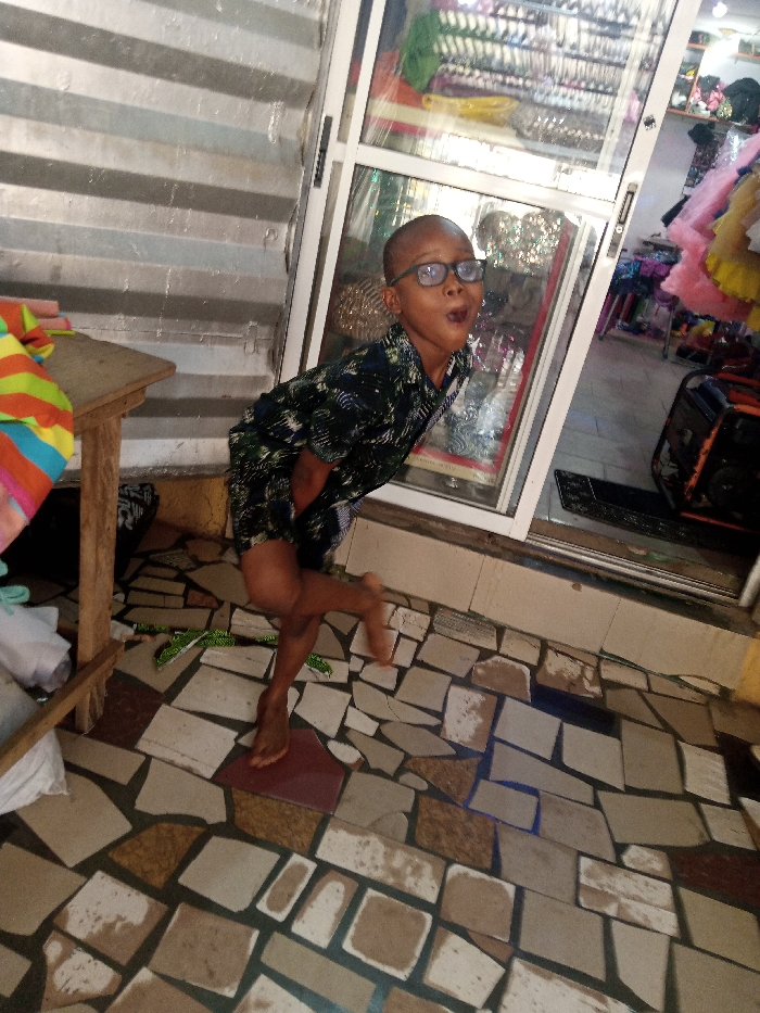A young, barefoot male, possibly pre-adolescent, is depicted mid-action in an indoor commercial setting within the city of Unknown, Unknown. He wears black-rimmed glasses and a dark, patterned short-sleeved shirt with matching shorts. His hair is closely cropped. The individual is leaning forward at the waist, with a wide-eyed expression and an open "O"-shaped mouth. His right knee is bent and lifted, while his left foot remains on a patchwork tile floor composed of irregularly shaped pieces in shades of brown, beige, and grey. To the left, a grey corrugated metal wall is visible. To the right, a white-framed glass shopfront reveals rows of small, shiny items, colorful fabrics, and a portable generator. A wooden table draped with a multi-colored striped fabric occupies the lower-left foreground.