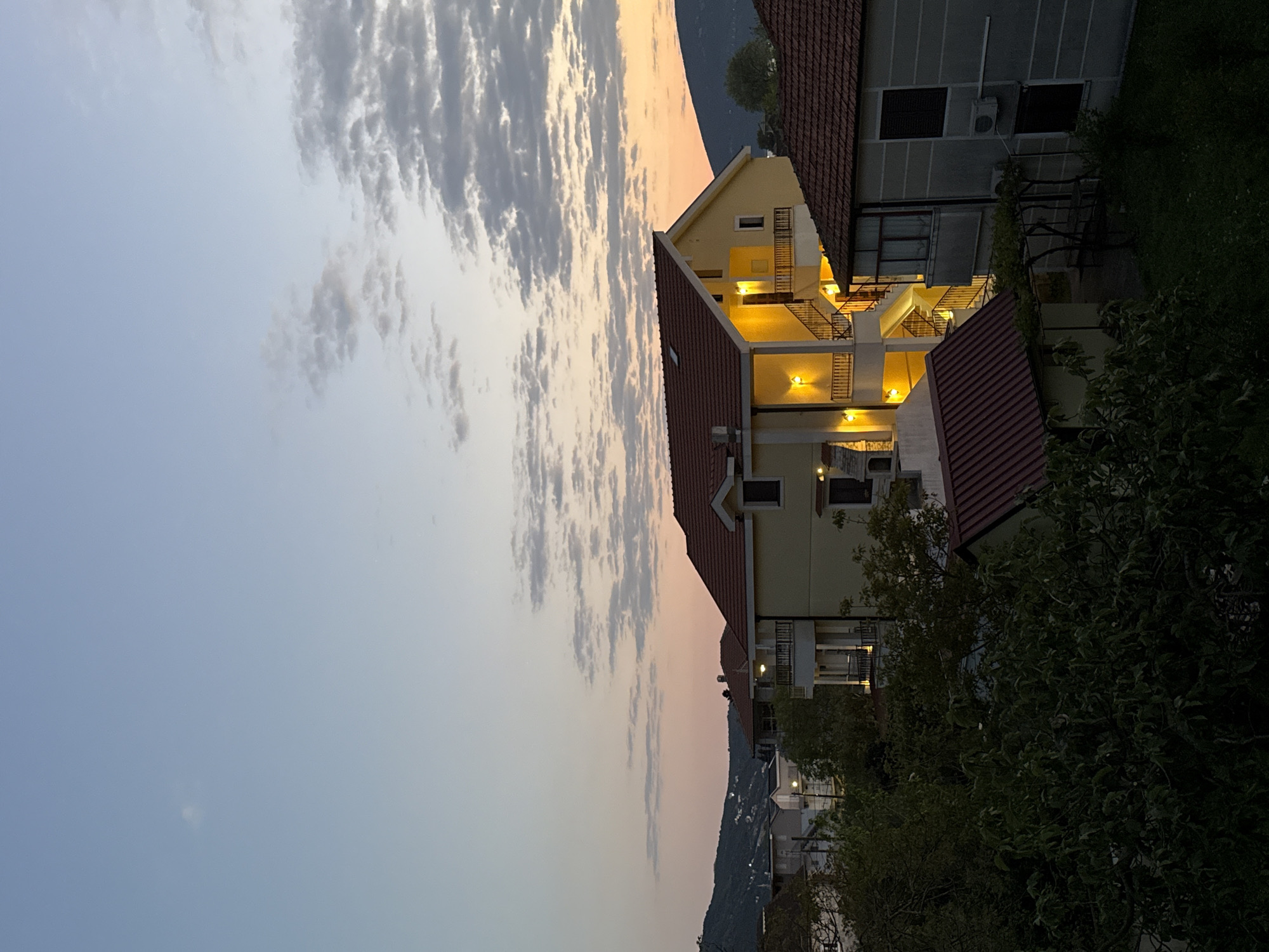 The image captures a multi-story building in Zelenika, Montenegro, during dusk or twilight. The building is predominantly yellow with red roofs, and appears to be a hotel or apartment complex, as evidenced by multiple balconies and external staircases illuminated with lights. Adjacent to this building is another structure with a grayish facade and visible air conditioning units. The surrounding environment includes trees and vegetation, indicating a residential or suburban setting. In the background, distant mountains can be seen against the sky, which is transitioning from light blue to shades of orange and gray with scattered clouds. There are no people visible in the frame. The overall scene is serene and peaceful, characteristic of a coastal town at dusk.