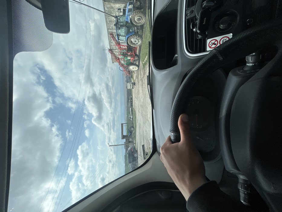 The image depicts a driver's perspective from inside a vehicle, looking out the front windshield in Srednia, Bulgaria. A right hand rests on a black, perforated leather steering wheel, with the dashboard visible below. Through the windshield, an unpaved lot or farmyard unfolds under a sky filled with scattered cumulus clouds. In the middle-ground to the right, a blue tractor is parked next to a light-colored concrete building, equipped with a large red boom sprayer attachment. Further left in the background, a green tractor, a dark SUV, and a white utility van are visible, along with various flatbed trailers and agricultural equipment. A small, dark animal (possibly a dog) stands near the white van. Utility poles and power lines traverse the upper half of the scene. Distant fields and hills are visible on the horizon beneath the cloudy sky.