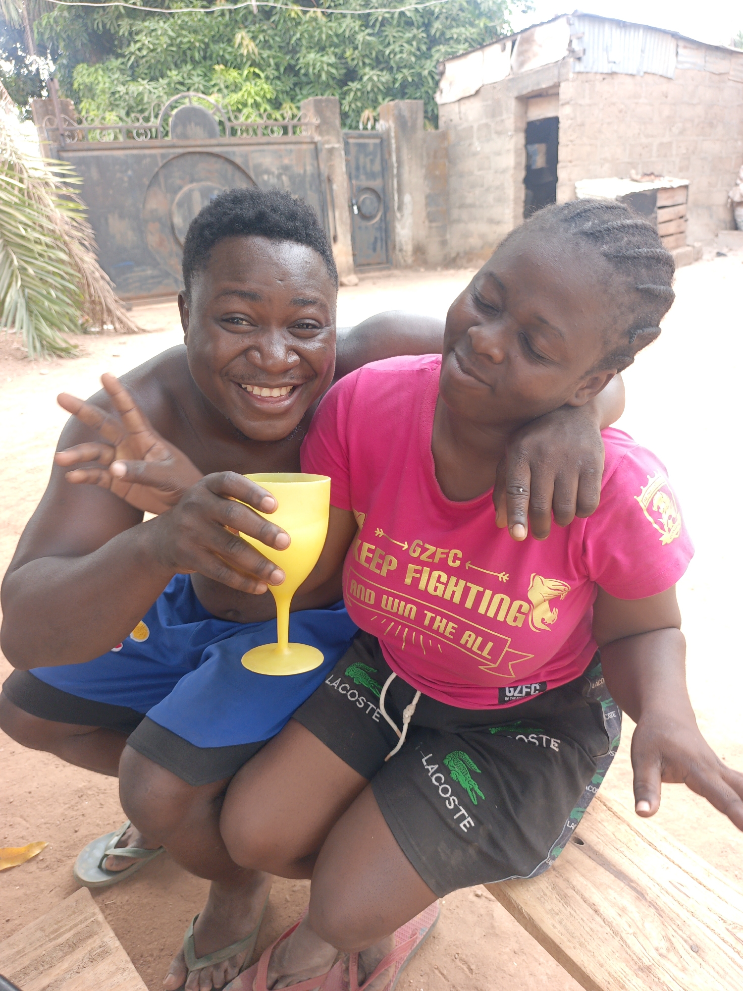 The image displays two adult individuals, a male and a female, in an outdoor setting within a semi-urban or rural area of Akwanga, Nigeria. The male, positioned on the left and partially squatting, presents with dark skin and short, dark hair. He is shirtless, wearing blue shorts and green flip-flops, and holds a bright yellow, stemmed goblet in his right hand. His left hand is raised, displaying a two-finger 'V' gesture, while his left arm extends around the female's shoulders. He exhibits a wide smile and looks directly towards the camera. The female, positioned on the right and seated on a light-colored wooden surface, has dark skin and braided dark hair. She wears a pink short-sleeved t-shirt with gold text reading "GZFC -> KEEP FIGHTING AND WIN THE ALL" and a stylized animal graphic. Her lower attire consists of black shorts with "LACOSTE" branding, and she wears red flip-flops. Her eyes are closed or directed downward, and her expression suggests contentment as she leans into the male. Her right hand rests on the wooden surface. The ground consists of reddish-brown dirt. The background features green foliage from trees and a large dark metal gate with circular embellishments on the left. To the right, an unfinished concrete block structure with a corrugated metal roof and a dark doorway opening is visible. A dried palm frond is present on the far left.
