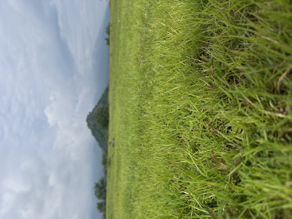 A field of vibrant green grass fills the frame, extending from the bottom to the right edge. Patches of taller grass mix with shorter blades. A distant mountain rises against a backdrop of cloudy sky. Trees dot the landscape near the mountain. The image is slightly tilted.