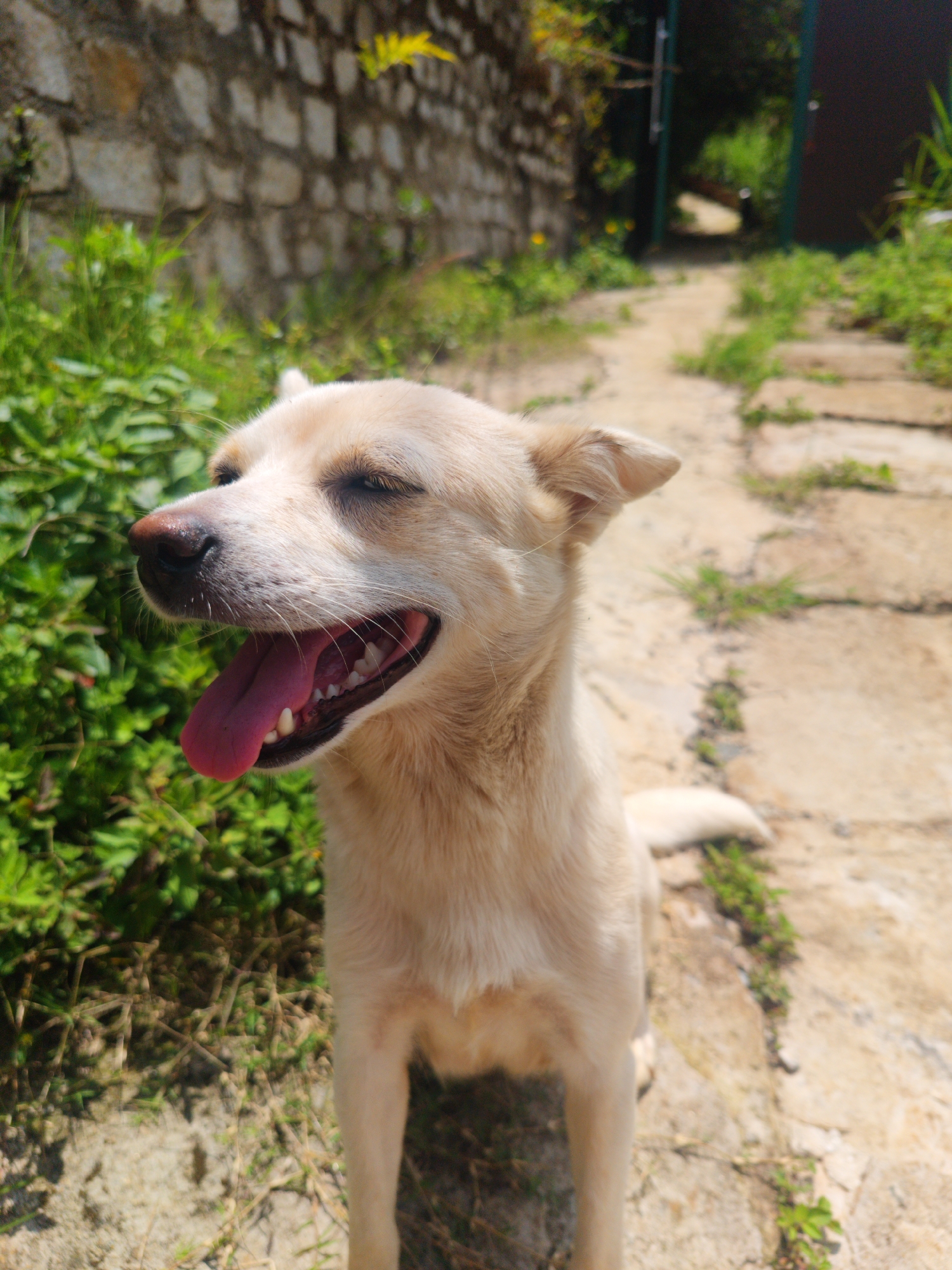 - "light-colored dog with its tongue hanging out, positioned on a stone path lined with vegetation" by FM-sknwy2, licensed under CC BY 4.0