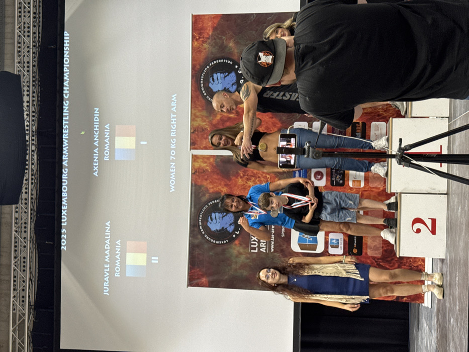 A podium presentation for the 2025 Luxembourg Armwrestling Championship, Women 70 kg Right Arm