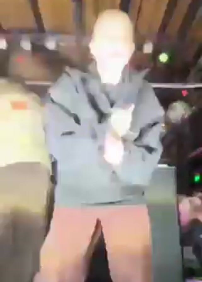 person dancing under flashing lights. The individual has a shaved head and is wearing a dark hoodie and brown pants. They are in a crowded indoor venue with people in the background and disco balls hanging from the ceiling. The lighting is multi-colored, with blues, greens, and reds, and changes throughout the video. The person is dancing and gesturing with their hands towards the camera.