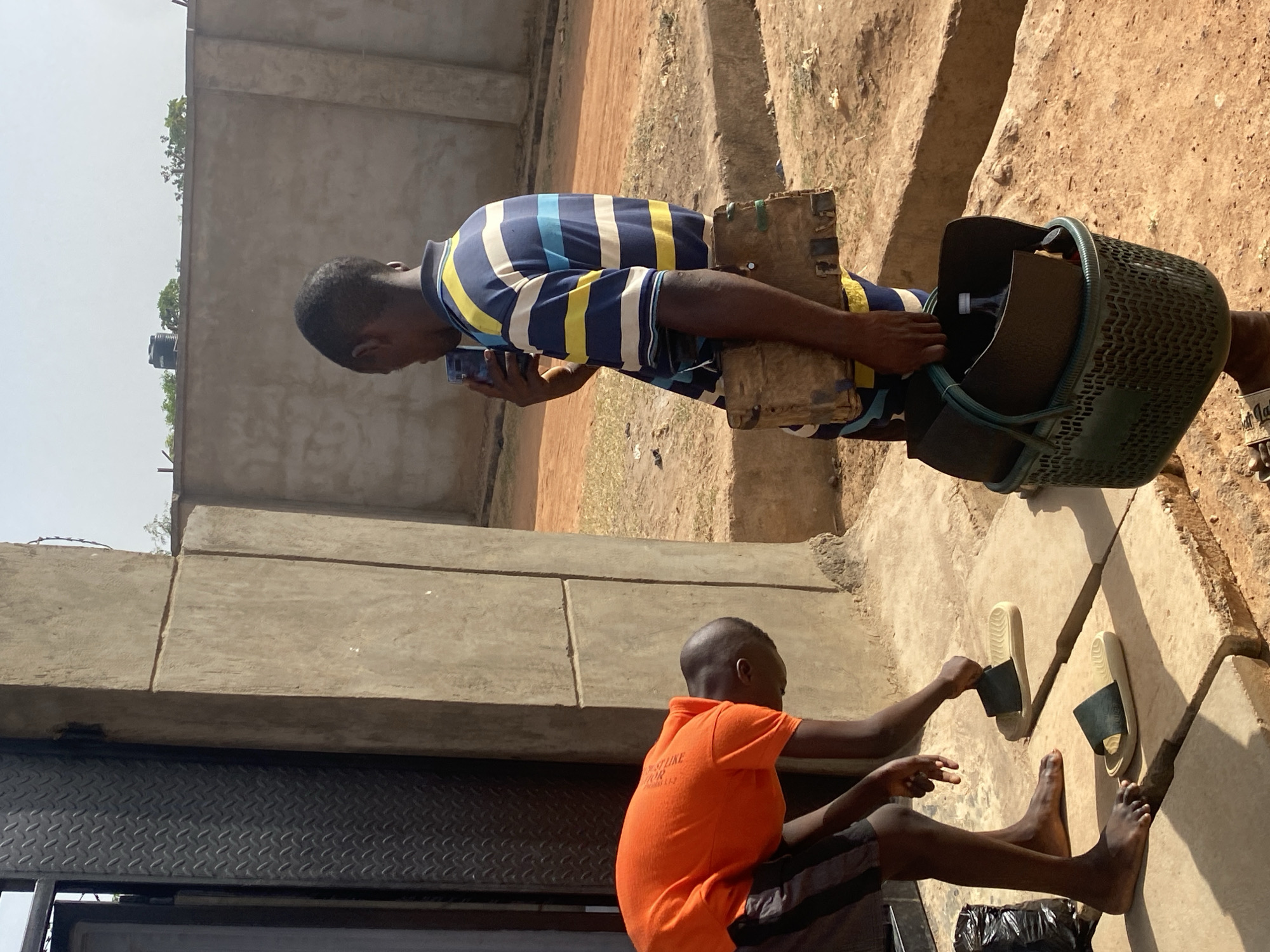 In Rido, Nigeria, the scene depicts two individuals in an outdoor setting. One man, wearing a striped shirt, sits on a wooden stool and is looking at a mobile phone. He carries a basket containing bottles. The other man, wearing an orange shirt, sits on the ground, handling sandals. The environment includes concrete structures, dirt surfaces, and foliage.