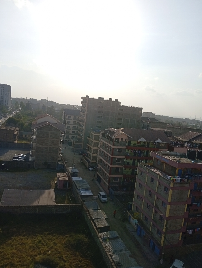 An urban landscape with densely packed buildings. A mix of high-rise apartments and smaller residential structures dominates the scene. The buildings are constructed with brick and concrete. Between the buildings runs a narrow street, with parked cars. The sky appears bright, with a hazy sun, creating an overall sense of warm sunlight. The foreground consists of a grassy area.