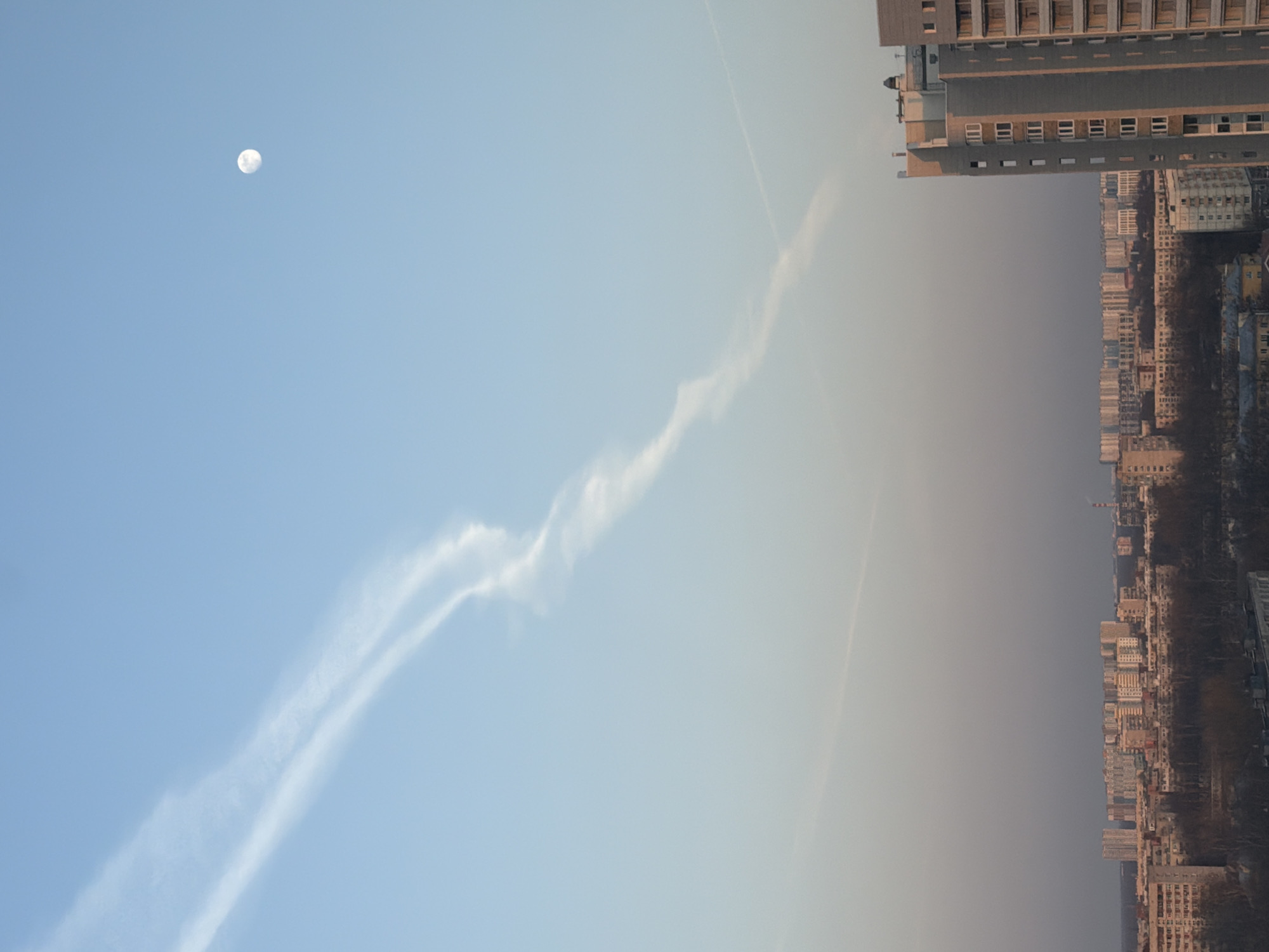 cityscape, possibly taken in Saint Petersburg, Russia. The sky is a gradient of blue with a pale moon visible in the upper left. Contrails stretch across the sky, suggesting recent air traffic. The right side of the image features dense urban development with numerous buildings. The lighting indicates it might be either sunrise or sunset, casting a haze over the city. The photograph is taken from an elevated position, providing a broad view of the urban landscape.