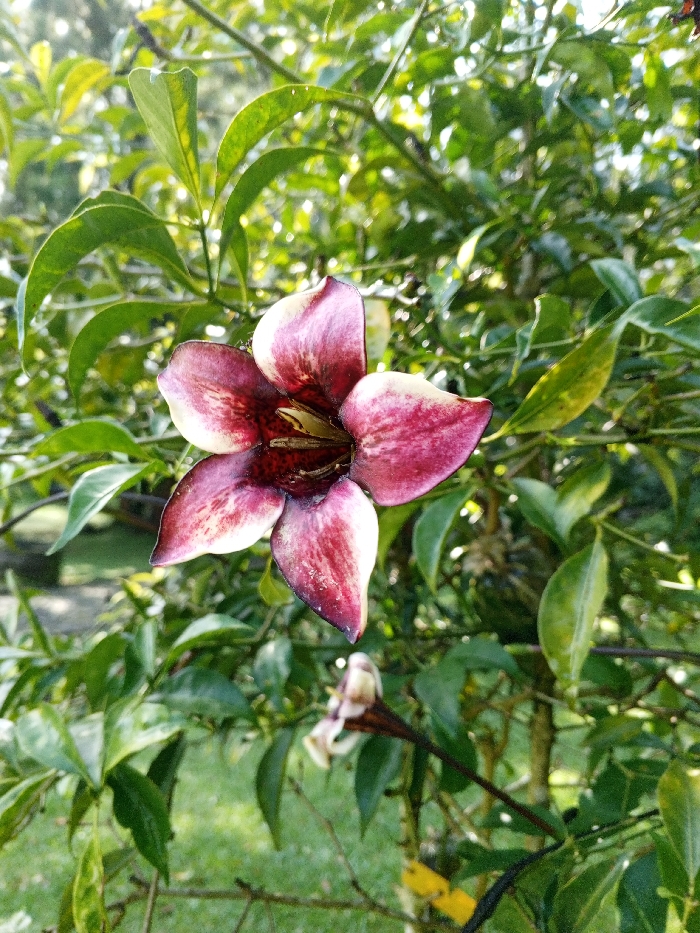 A vibrant pink and white flower with visible veins is centered in the frame. It has five petals and a complex dark center. The flower is surrounded by lush green foliage, with leaves of varying shades and sizes filling the background. A blurred grassy area with a bench is visible in the background. Another flower bud is visible below the main flower. The lighting suggests a sunny day.